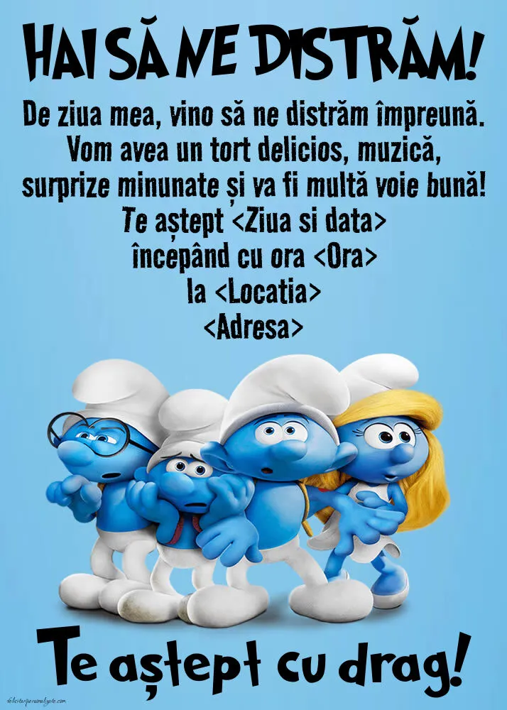 Invitația cu Ștrumfi la ziua de naștere pe fundal albastru pentru zi de naștere copii este editabilă online gratis și are dimensiunile 714px x 1000px.