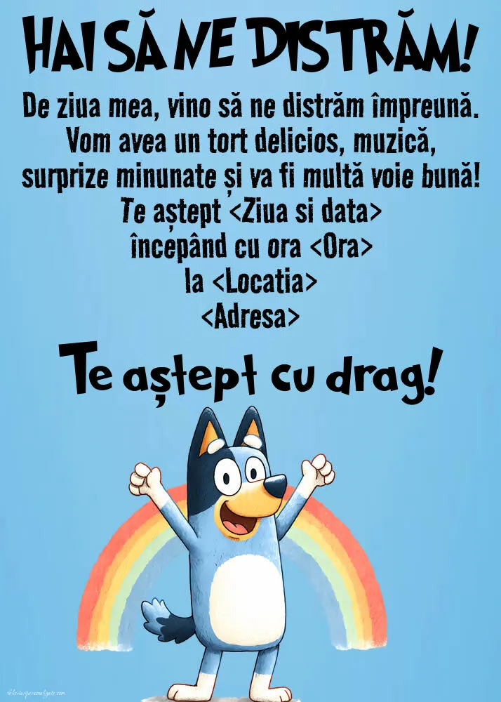 Se apropie ziua copilului tău și nu știi cum să-i inviți prietenii la petrecere într-un mod original? În mai putin de două minute poți să personalizezi online această invitație pentru copii cu Bluey cu un curcubeu pe fundal albastru. Așa, invitația o rezolvi rapid și câștigi timp pentru organizarea petrecerii!