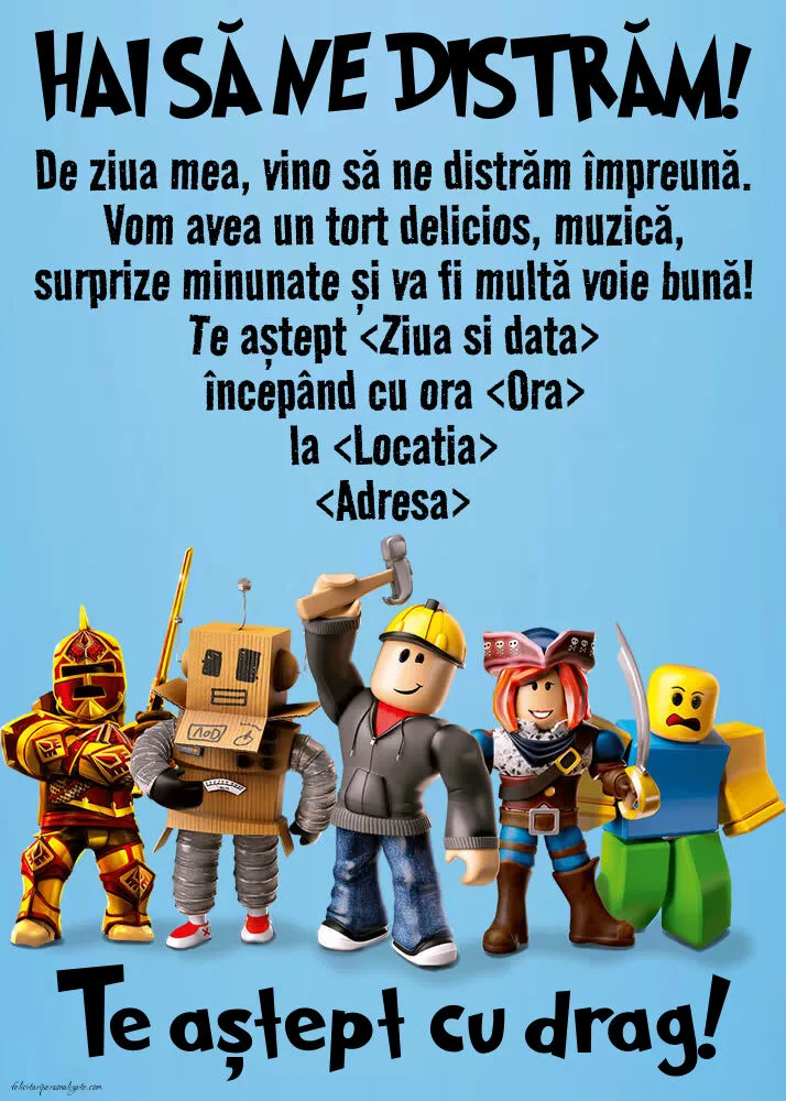 Se apropie ziua copilului tău și nu știi cum să-i inviți prietenii la petrecere într-un mod original? În mai putin de două minute poți să personalizezi online această invitație pentru copii cu personaje din Roblox pe fundal albastru. Așa, invitația o rezolvi rapid și câștigi timp pentru organizarea petrecerii!