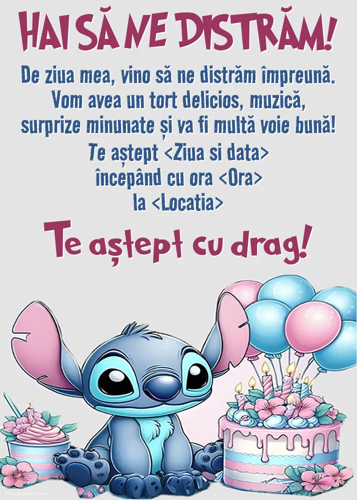 Invitație cu Stitch - De ziua mea, vino să ne distrăm împreună | Personalizare invitatii la zi de naștere copii