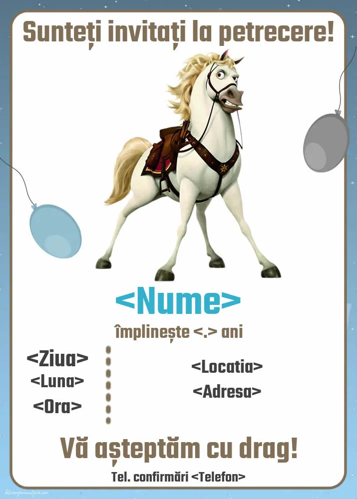 Se apropie ziua copilului tău și nu știi cum să-i inviți prietenii la petrecere într-un mod original? În mai putin de două minute poți să personalizezi online această invitație pentru copii cu Maximus, calul lui Flynn Rider din filmul O poveste încâlcită. Așa, invitația o rezolvi rapid și câștigi timp pentru organizarea petrecerii!