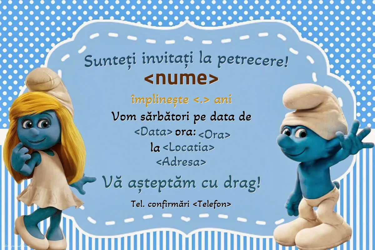 Se apropie ziua copilului tău și nu știi cum să-i inviți prietenii la petrecere într-un mod original? În mai putin de două minute poți să personalizezi online această invitație pentru copii cu Ștrumpfița și Clumsy Ștrumf. Așa, invitația o rezolvi rapid și câștigi timp pentru organizarea petrecerii!