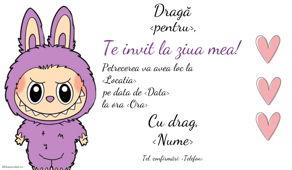 Se apropie ziua copilului tău și nu știi cum să-i inviți prietenii la petrecere într-un mod original? În mai putin de două minute poți să personalizezi online această invitație pentru copii cu Labubu și inimioare. Așa, invitația o rezolvi rapid și câștigi timp pentru organizarea petrecerii!