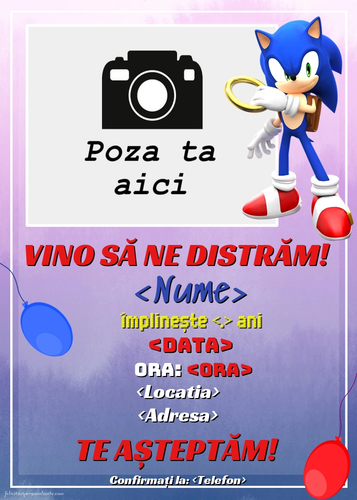 Invitația cu Sonic este editabilă online gratuit, are dimensiunile 714 x 1000 px și poate fi descărcată, imprimată sau trimisă direct prin WhatsApp, Facebook, Twitter ori Pinterest. Ideală pentru o petrecere în stilul Sonic – plină de viteză, culoare și voie bună!