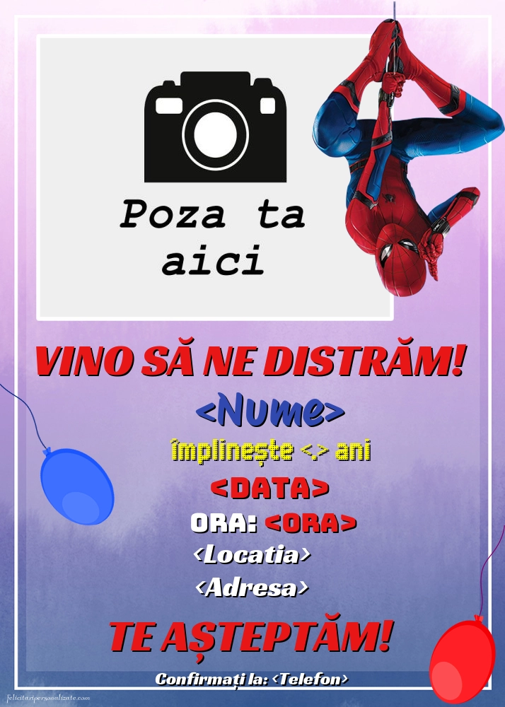 Cu această invitație cu Spiderman și fotografia sărbătoritului, transformi anunțul petrecerii într-un moment plin de energie și stil, iar tu economisești timp prețios pentru organizarea unui eveniment de care copilul tău se va bucura pe deplin. Simplu, rapid și perfect pentru o aniversare de supererou!