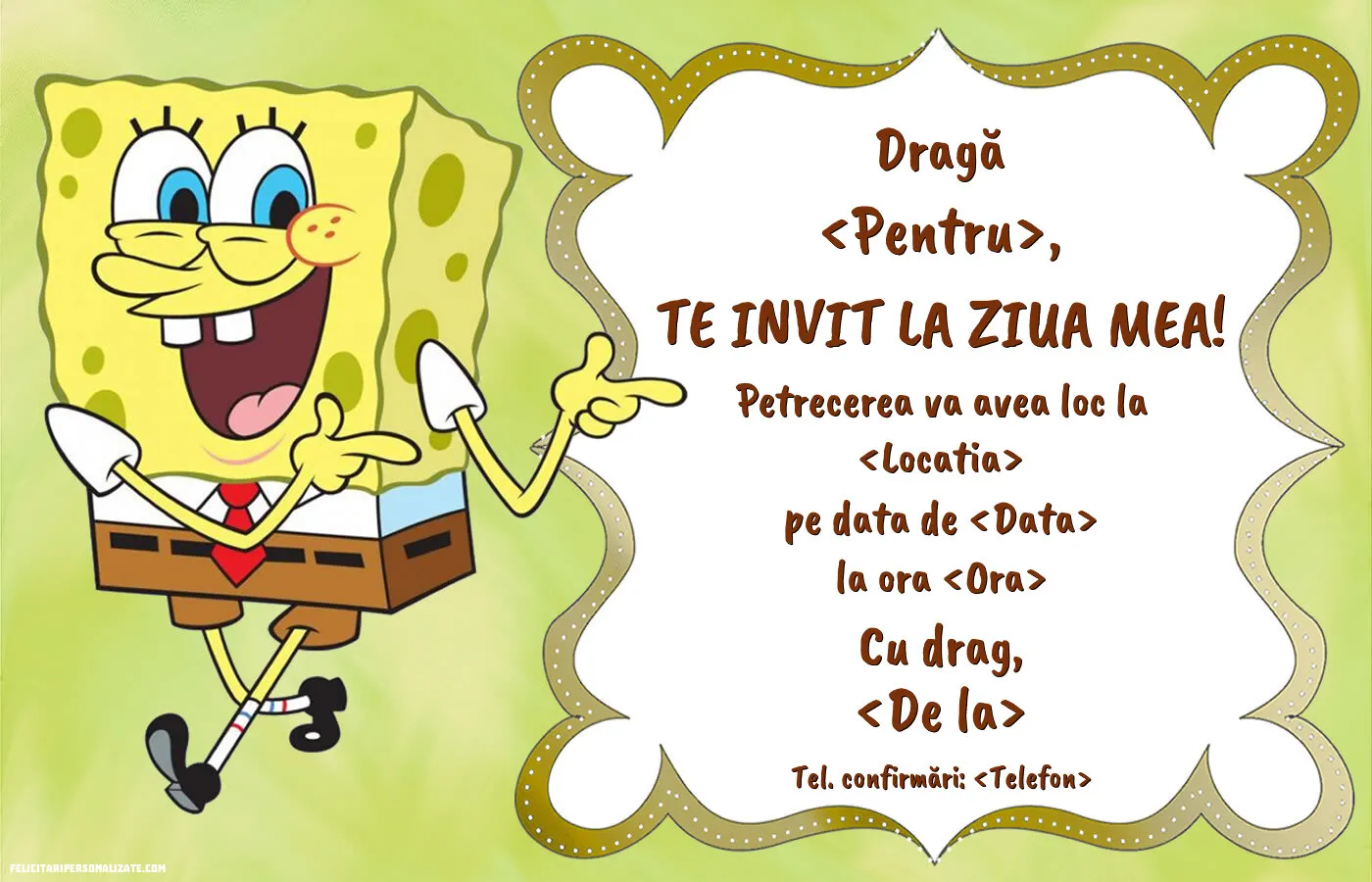 Se apropie ziua copilului tău și nu știi cum să-i inviți prietenii la petrecere într-un mod original? În mai putin de două minute poți să personalizezi online această invitație pentru copii cu SpongeBob Pantaloni Pătrați. Așa, invitația o rezolvi rapid și câștigi timp pentru organizarea petrecerii!