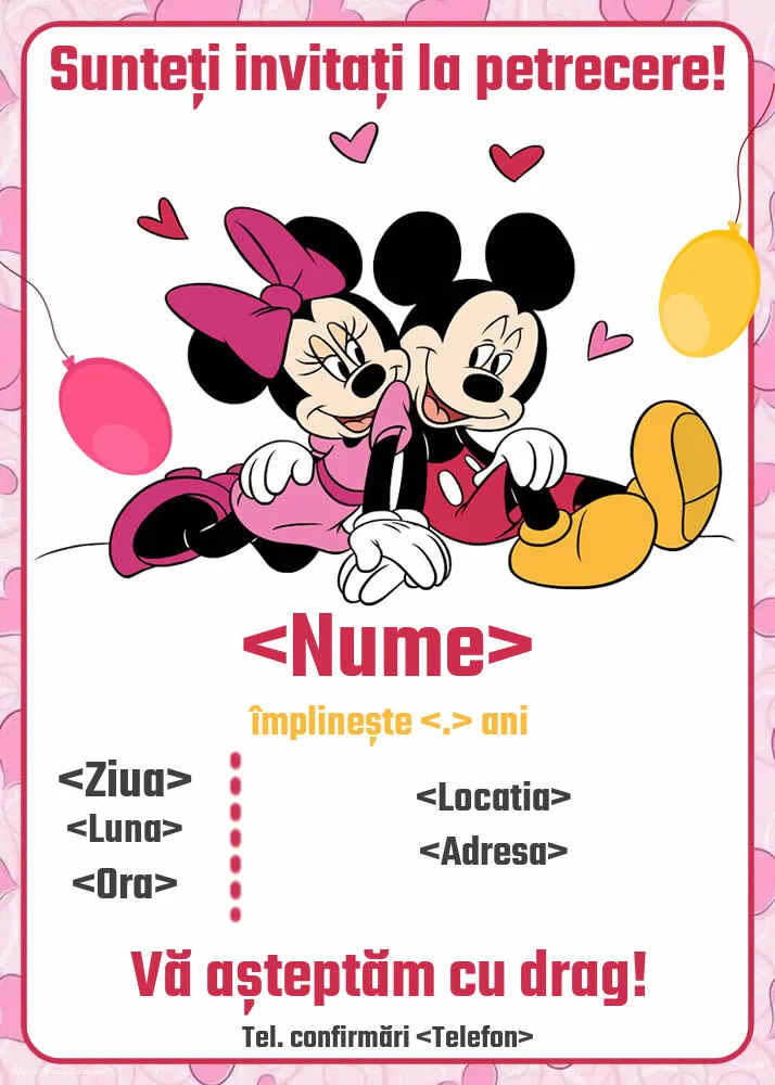 Cu un design vesel, dominat de inimioare și baloane colorate, invitația cu Mickey și Minnie Mouse aduce un strop de magie Disney în fiecare detaliu. Este perfectă pentru o petrecere de zi de naștere plină de zâmbete, momente speciale și amintiri care vor rămâne mult timp în sufletul tuturor celor dragi.