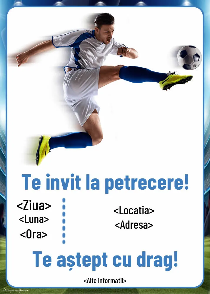 Se apropie ziua copilului tău și nu știi cum să-i inviți prietenii la petrecere într-un mod original? În mai putin de două minute poți să personalizezi online această invitație pentru copii cu fotbalist cu mingea. Așa, invitația o rezolvi rapid și câștigi timp pentru organizarea petrecerii!