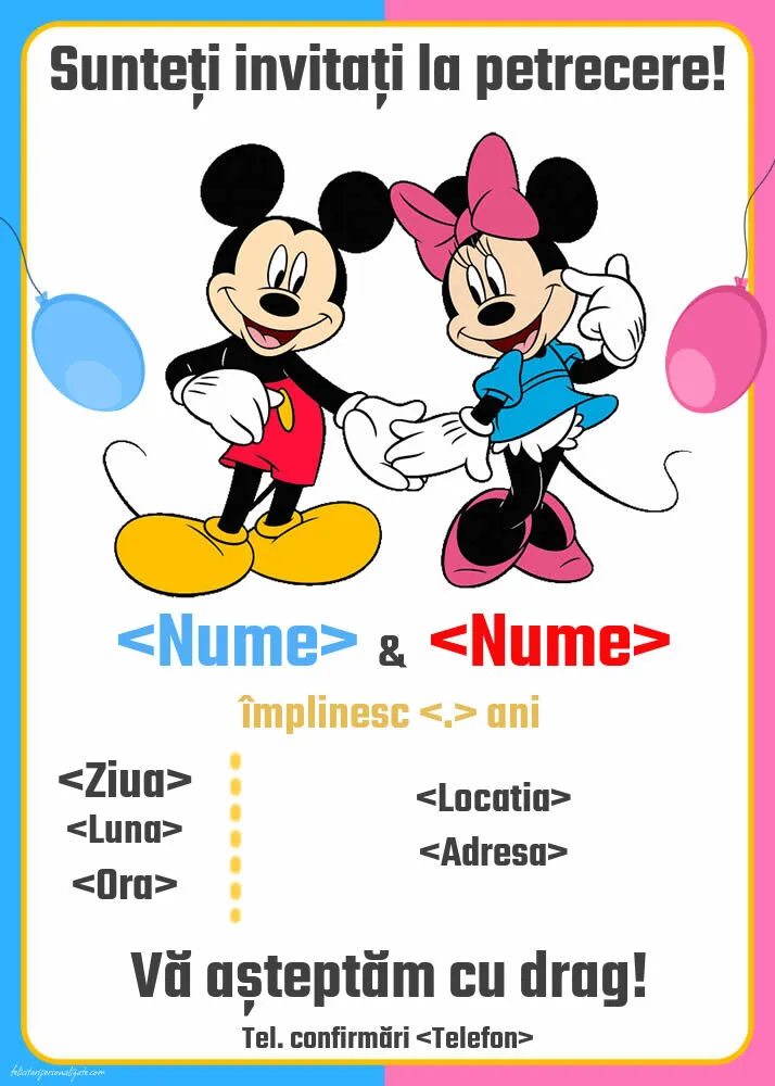 Se apropie ziua copilului tău și nu știi cum să-i inviți prietenii la petrecere într-un mod original? În mai putin de două minute poți să personalizezi online această invitație pentru copii cu Mickey și Minnie Mouse pentru gemeni. Așa, invitația o rezolvi rapid și câștigi timp pentru organizarea petrecerii!