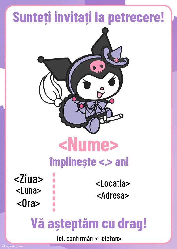 Se apropie ziua copilului tău și nu știi cum să-i inviți prietenii la petrecere într-un mod original? În mai putin de două minute poți să personalizezi online această invitație pentru copii cu Kuromi. Așa, invitația o rezolvi rapid și câștigi timp pentru organizarea petrecerii!