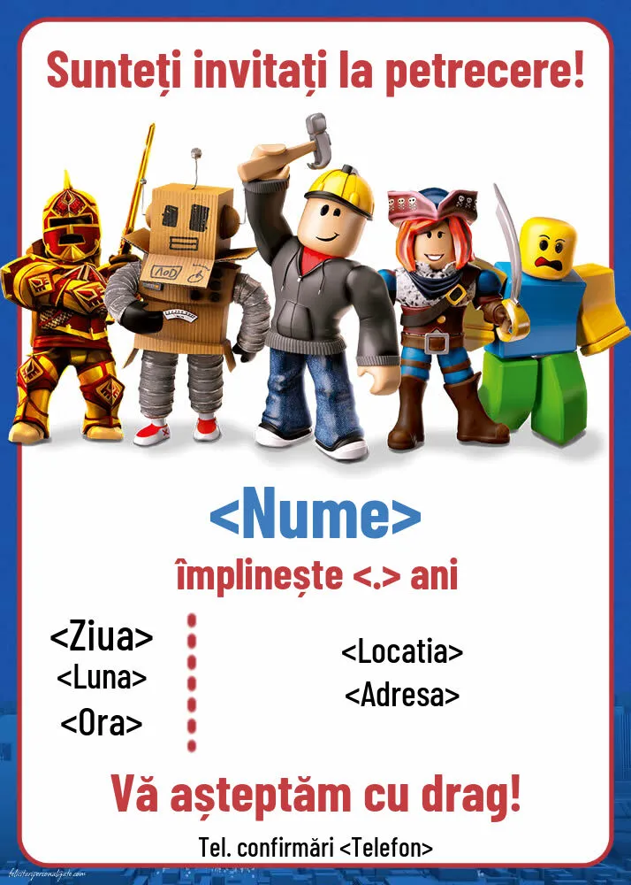 Se apropie ziua copilului tău și nu știi cum să-i inviți prietenii la petrecere într-un mod original? În mai putin de două minute poți să personalizezi online această invitație pentru copii cu personaje Roblox. Așa, invitația o rezolvi rapid și câștigi timp pentru organizarea petrecerii!