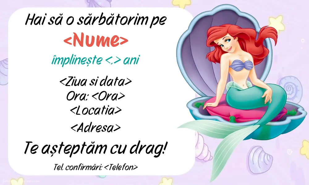Cu această invitație cu sirena Ariel, trimiți un mesaj plin de culoare și bucurie, iar tu economisești timp prețios pentru organizarea petrecerii de ziua copilului tău. Simplu de realizat, accesibil și perfect pentru o aniversare plină de magie!