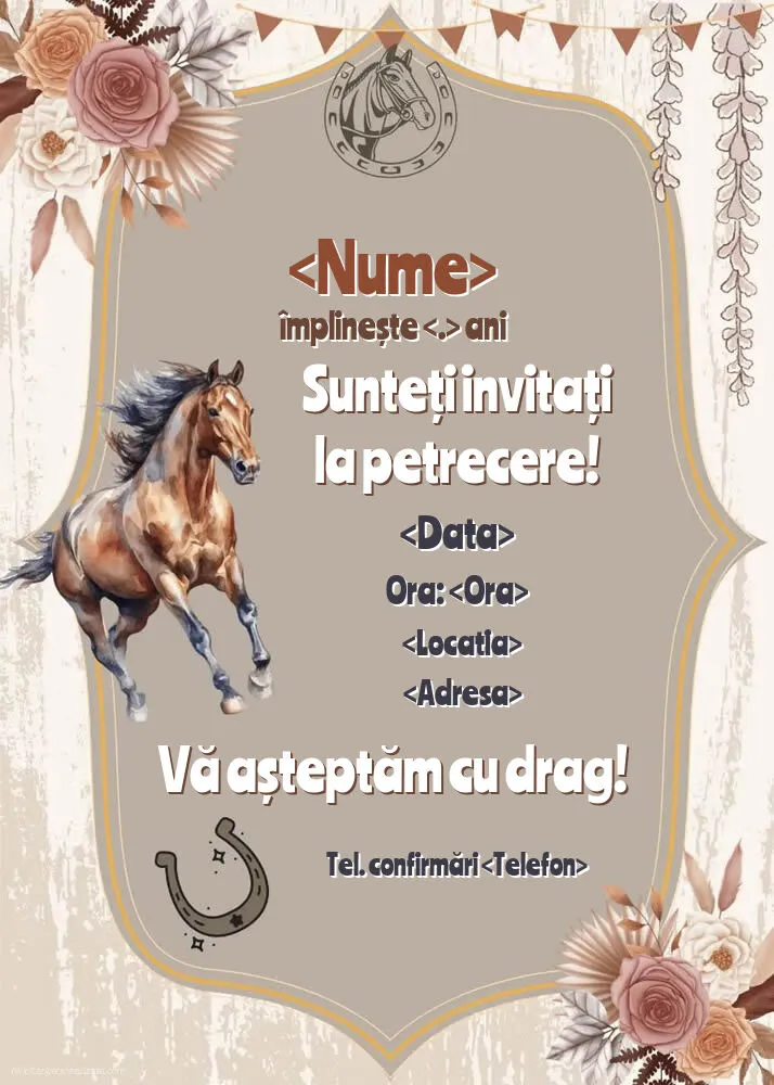 Se apropie ziua copilului tău și nu știi cum să-i inviți prietenii la petrecere într-un mod original? În mai putin de două minute poți să personalizezi online această invitație pentru copii cu un cal și o potcoavă pe fundal maro. Așa, invitația o rezolvi rapid și câștigi timp pentru organizarea petrecerii!