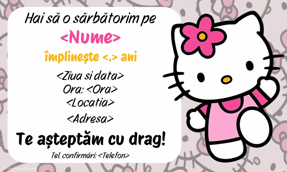 Această invitație pentru copii, având-o în prim-plan pe îndrăgita Hello Kitty, este ideală pentru fetițele care adoră personajele simpatice și universul lor vesel. Designul luminos, jucăuș și dulce transformă invitația într-un mesaj plin de bucurie, perfect pentru a anunța o aniversare specială.
