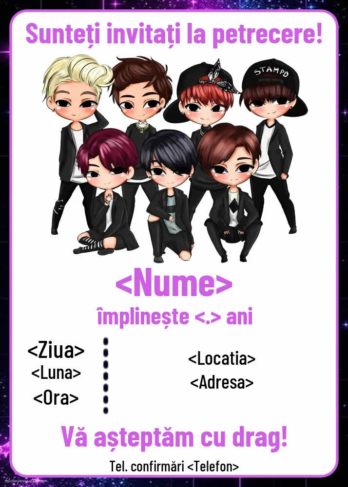 Se apropie ziua copilului tău și nu știi cum să-i inviți prietenii la petrecere într-un mod original? În mai putin de două minute poți să personalizezi online această invitație pentru copii cu o trupă kpop de fete (BTS kpop group). Așa, invitația o rezolvi rapid și câștigi timp pentru organizarea petrecerii!