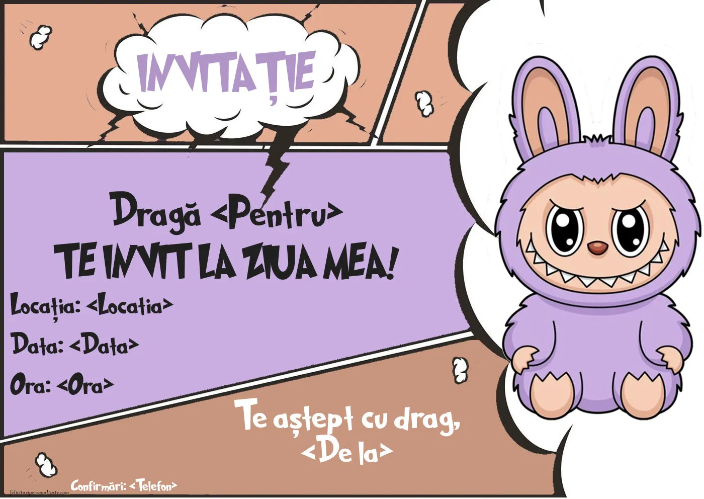 Se apropie ziua copilului tău și nu știi cum să-i inviți prietenii la petrecere într-un mod original? În mai putin de două minute poți să personalizezi online această invitație pentru copii cu Labubu mov. Așa, invitația o rezolvi rapid și câștigi timp pentru organizarea petrecerii!