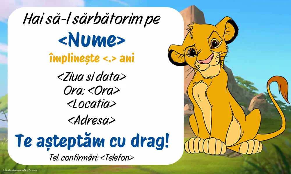 În mai puțin de două minute poți completa formularul online și poți crea această invitație pentru copii cu Simba, Regele Leu — ideală pentru băieții care iubesc aventura, curajul și poveștile pline de emoție.