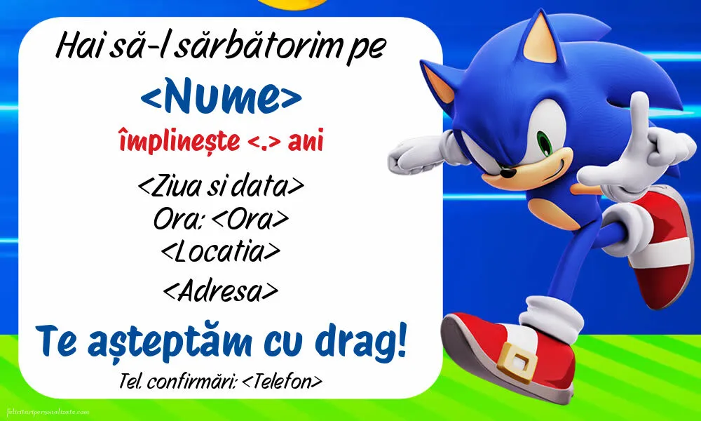 Transformă ziua de naștere a băiatului tău într-o adevărată aventură cu această invitație cu Sonic, veselă și ușor de personalizat.