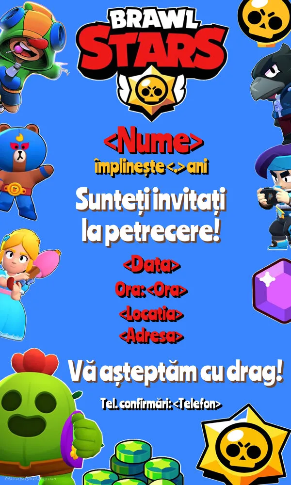 Invitația cu caractere din jocul Brawl Stars pentru zi de naștere copii este editabilă online gratis și are dimensiunile 600px x 1000px.