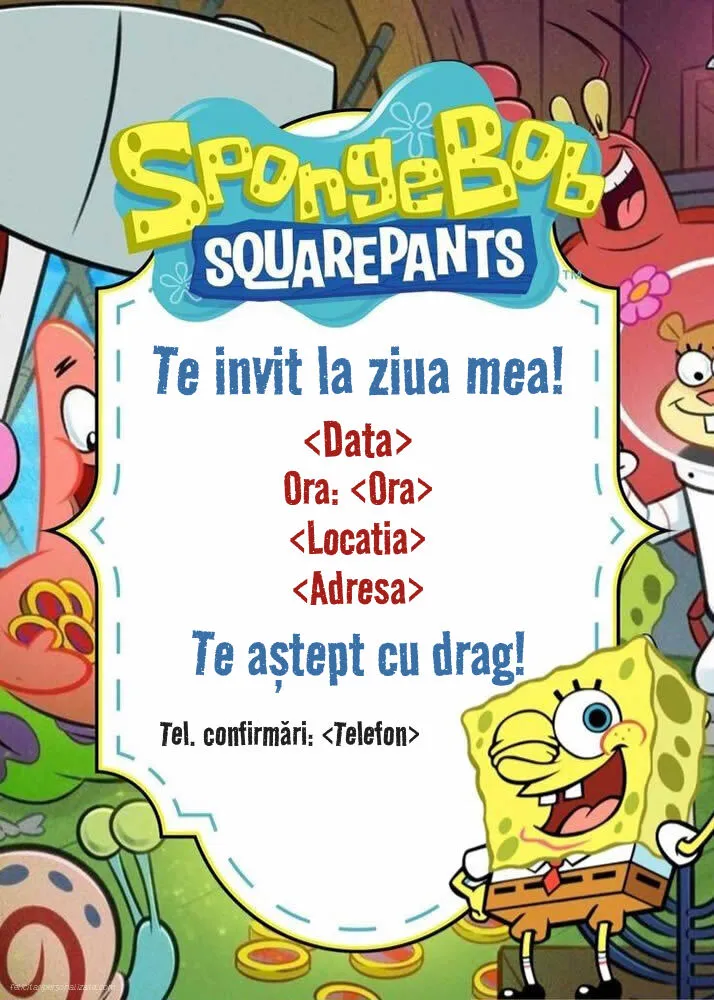 Se apropie ziua copilului tău și nu știi cum să-i inviți prietenii la petrecere într-un mod original? În mai putin de două minute poți să personalizezi online această invitație pentru copii cu SpongeBob Pantaloni Pătrați și Patrick. Așa, invitația o rezolvi rapid și câștigi timp pentru organizarea petrecerii!