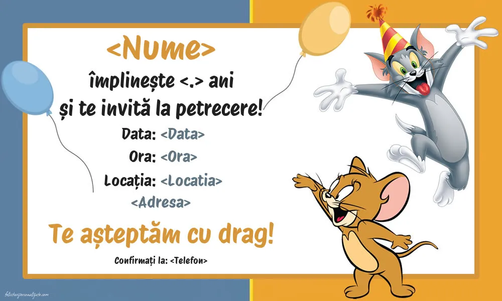 Se apropie ziua copilului tău și nu știi cum să-i inviți prietenii la petrecere într-un mod original, haioasă și plin de energie? În mai puțin de două minute poți completa formularul online și poți crea această invitație adorabilă pentru copii, cu Tom și Jerry și baloane colorate.