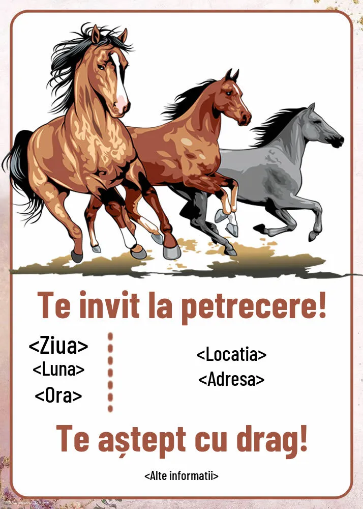 Se apropie ziua copilului tău și nu știi cum să-i inviți prietenii la petrecere într-un mod original? În mai putin de două minute poți să personalizezi online această invitație pentru copii cu 3 cai frumoși. Așa, invitația o rezolvi rapid și câștigi timp pentru organizarea petrecerii!