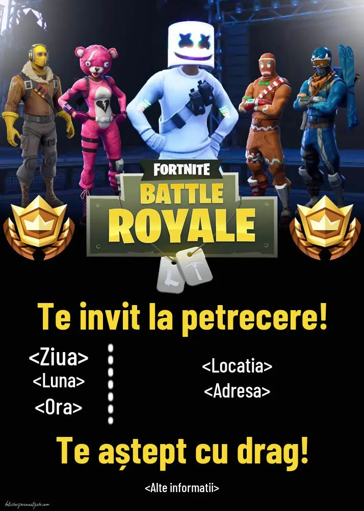 Invitația cu personaje din jocul video Fortnite pentru zi de naștere copii este editabilă online gratis și are dimensiunile 714px x 1000px.