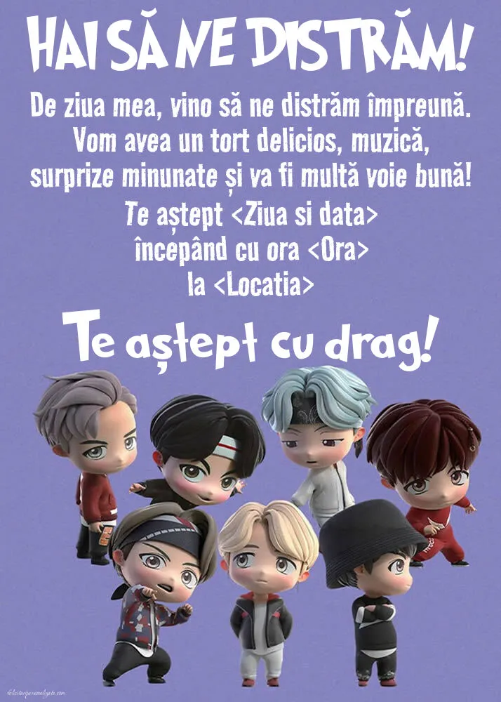 Se apropie ziua copilului tău și nu știi cum să-i inviți prietenii la petrecere într-un mod original? În mai putin de două minute poți să personalizezi online această invitație pentru copii cu trupa KPop BTS. Așa, invitația o rezolvi rapid și câștigi timp pentru organizarea petrecerii!
