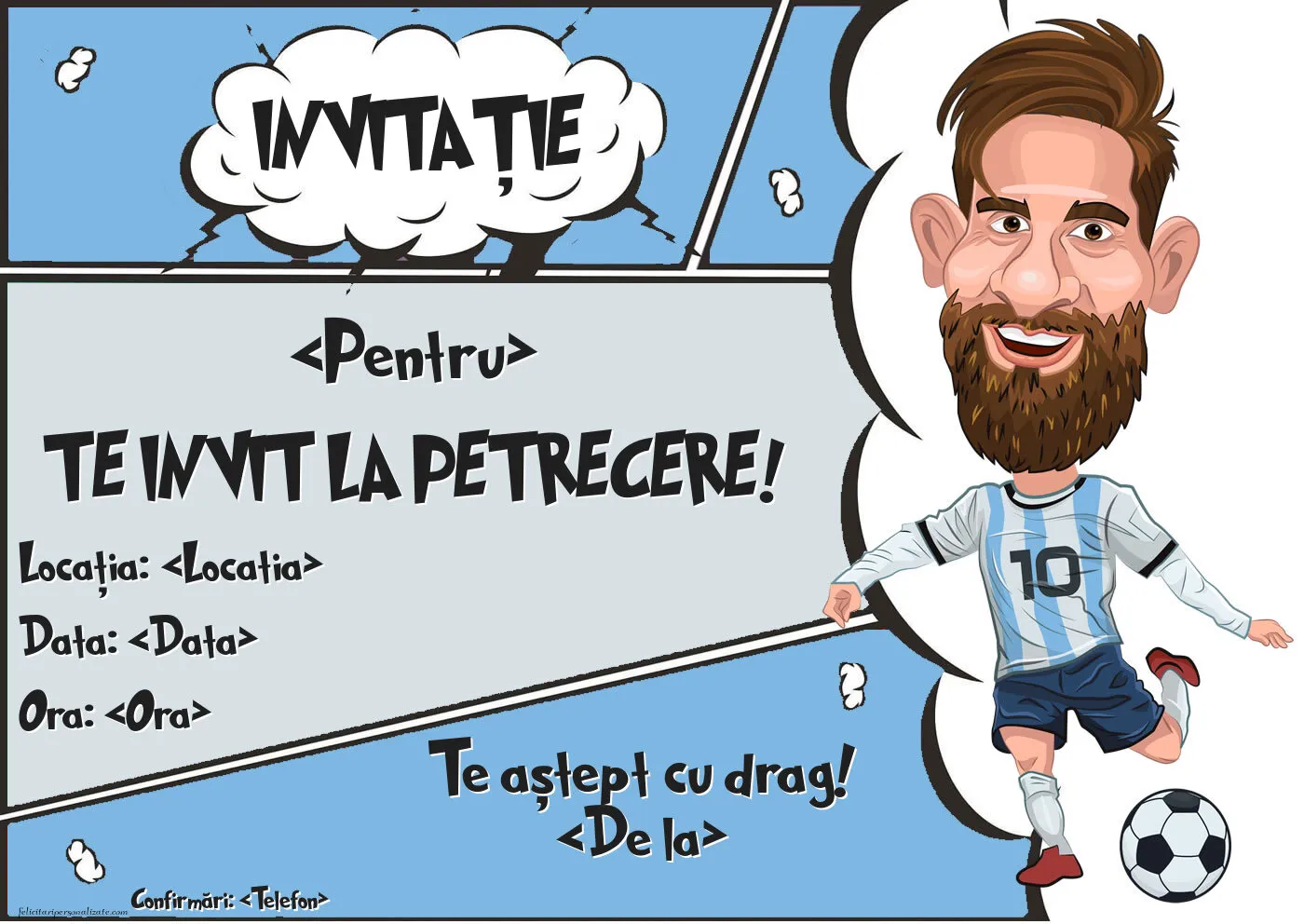Se apropie ziua copilului tău și nu știi cum să-i inviți prietenii la petrecere într-un mod original? În mai putin de două minute poți să personalizezi online această invitație pentru copii cu caricatură cu Lionel Messi. Așa, invitația o rezolvi rapid și câștigi timp pentru organizarea petrecerii!