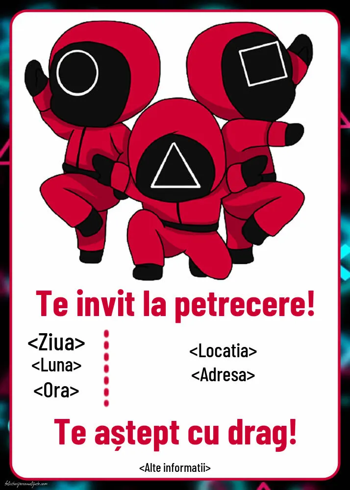 Se apropie ziua copilului tău și nu știi cum să-i inviți prietenii la petrecere într-un mod original? În mai putin de două minute poți să personalizezi online această invitație pentru copii cu Squid Game. Așa, invitația o rezolvi rapid și câștigi timp pentru organizarea petrecerii!
