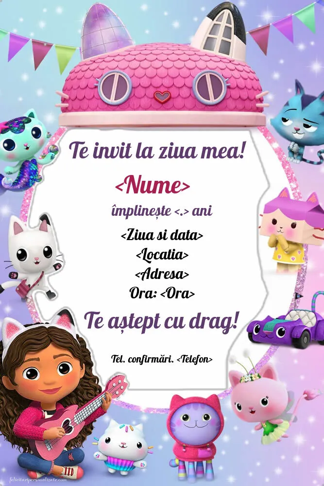 Se apropie ziua copilului tău și nu știi cum să-i inviți prietenii la petrecere într-un mod original? În mai putin de două minute poți să personalizezi online această invitație pentru copii cu Gabby's Dollhouse pentru petrecere fete. Așa, invitația o rezolvi rapid și câștigi timp pentru organizarea petrecerii!