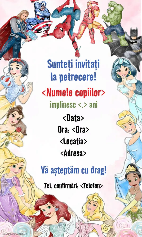 Se apropie ziua copilului tău și nu știi cum să-i inviți prietenii la petrecere într-un mod original? În mai putin de două minute poți să personalizezi online această invitație pentru copii cu eroi și prințese pentru gemeni (băiat și fată). Așa, invitația o rezolvi rapid și câștigi timp pentru organizarea petrecerii!