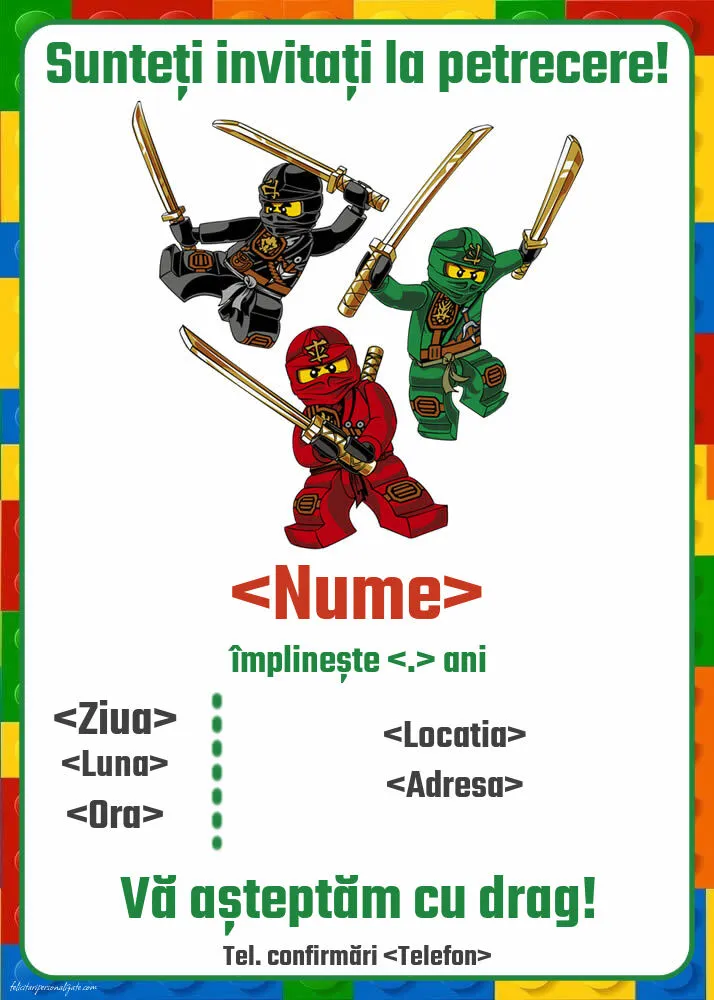 Se apropie ziua copilului tău și nu știi cum să-i inviți prietenii la petrecere într-un mod original? În mai putin de două minute poți să personalizezi online această invitație pentru copii cu 3 caractere ninjago LEGO. Așa, invitația o rezolvi rapid și câștigi timp pentru organizarea petrecerii!