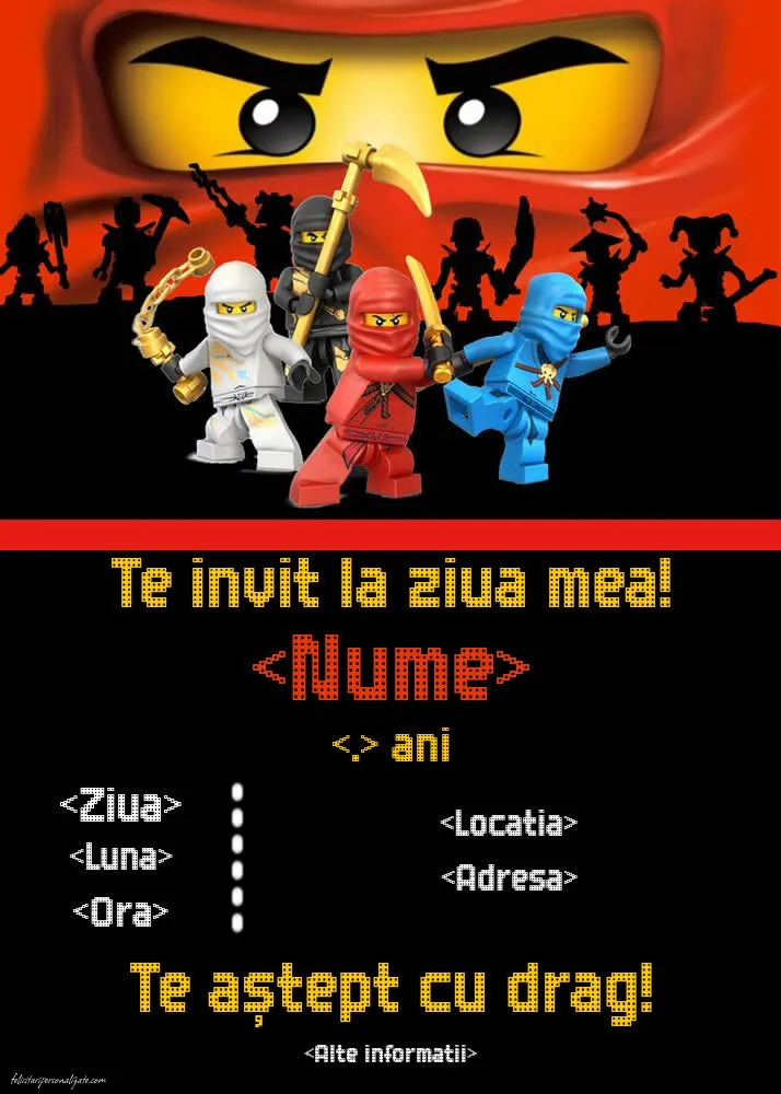 Cu această invitație cu caractere LEGO Ninjago pe fundal negru, poți anunța toți prietenii tăi că urmează o petrecere epică, demnă de un adevărat maestru ninja!