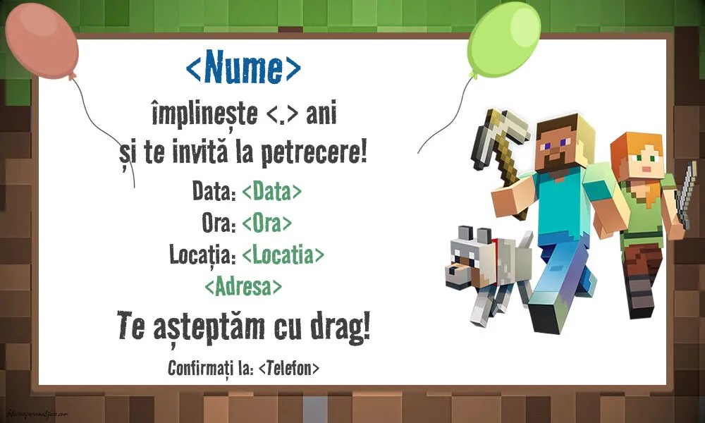 Se apropie ziua copilului tău și nu știi cum să-i inviți prietenii la petrecere într-un mod original? În mai putin de două minute poți să personalizezi online această invitație pentru copii cu Minecraft și baloane. Așa, invitația o rezolvi rapid și câștigi timp pentru organizarea petrecerii!