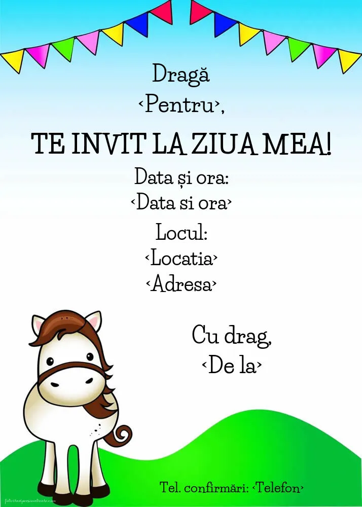 Se apropie ziua copilului tău și nu știi cum să-i inviți prietenii la petrecere într-un mod original? În mai putin de două minute poți să personalizezi online această invitație pentru copii cu un cal pe fundal de petrecere. Așa, invitația o rezolvi rapid și câștigi timp pentru organizarea petrecerii!