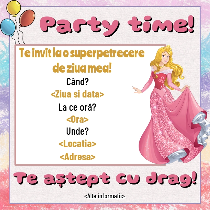 Se apropie ziua de naștere a copilului tău și vrei să-i inviți prietenii într-un mod original, magic și plin de culoare? Această invitație online cu prințesa Aurora este alegerea perfectă pentru a aduce farmec și bucurie încă de la primul click.