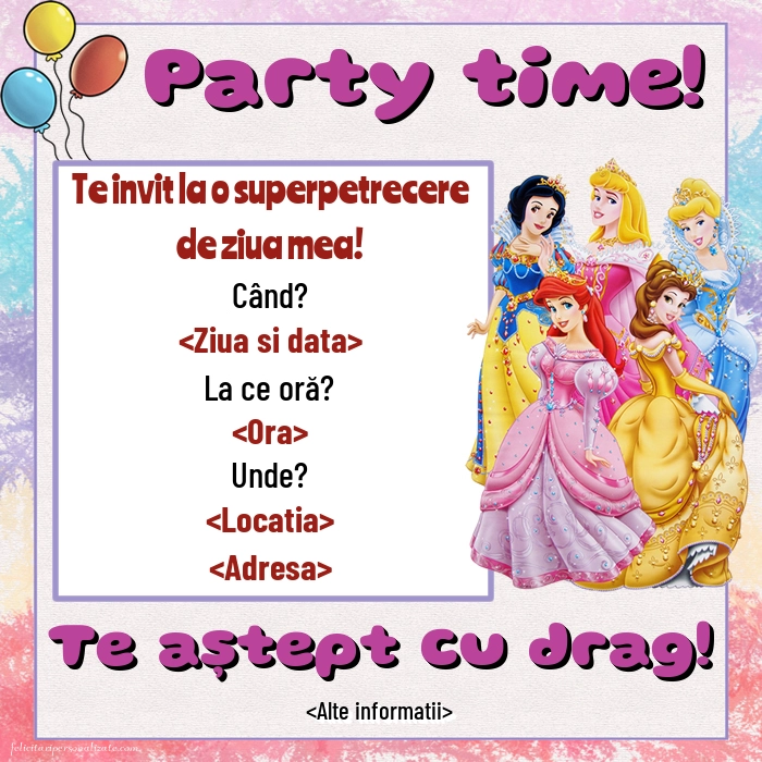 Cu această invitație cu prințese Disney, anunțul petrecerii devine un moment special, plin de magie și eleganță, iar tu economisești timp prețios pentru pregătirea unei aniversări de vis. Rapid, simplu și perfect pentru o fetiță care iubește lumea basmelor!