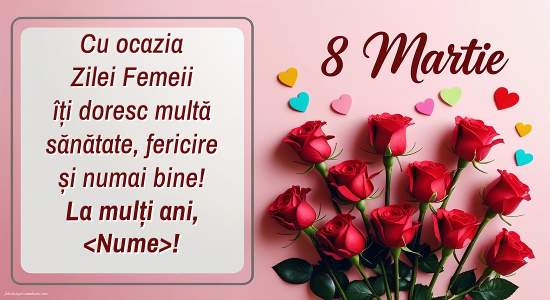 Felicitare personalizată de 8 Martie cu trandafiri roșii și inimioare – o alegere elegantă și plină de emoție pentru a transmite cele mai frumoase urări de Ziua Femeii. Designul romantic este completat de mesajul: „Cu ocazia Zilei Femeii îți doresc multă sănătate, fericire și numai bine! La mulți ani, {Nume}!”, transformând felicitarea într-un cadou digital special pentru persoana dragă.