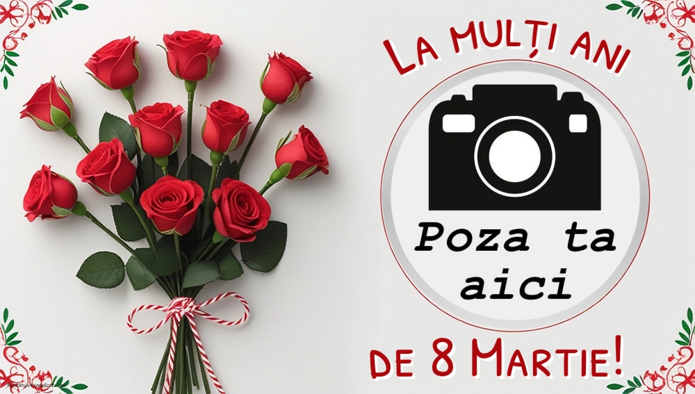 Felicitare personalizată de 8 Martie cu buchet de trandafiri roșii și ramă foto circulară – o modalitate elegantă și originală de a transmite cele mai frumoase urări de Ziua Femeii. Designul rafinat, completat de mesajul „La mulți ani de 8 Martie!”, permite adăugarea fotografiei tale, transformând felicitarea într-un cadou digital personal și memorabil.