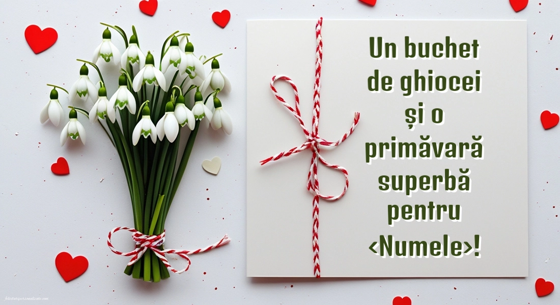 Imaginea cu buchetul de ghiocei și șnurul de Mărțișor, pe fundal cu inimioare, este personalizabilă cu nume și are dimensiunea de 1100px x 600px, fiind perfectă pentru a fi trimisă online.
