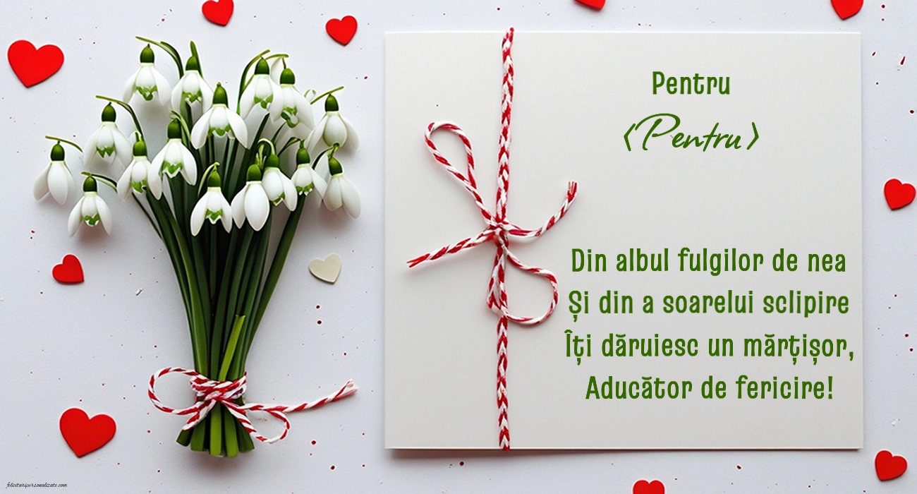 Designul delicat surprinde un buchet elegant de ghiocei legați cu tradiționalul fir alb-roșu, simbol al norocului, purității și începuturilor noi, așezat pe un fundal romantic decorat cu inimioare. Mesajul sensibil – „Pentru {Pentru} – Din albul fulgilor de nea și din a soarelui sclipire îți dăruiesc un mărțișor aducător de fericire” – adaugă o notă poetică și transformă felicitarea într-un dar cu adevărat special.