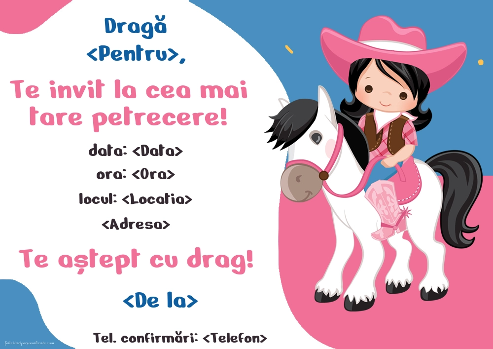 Fiecare invitație poate fi personalizată cu numele sărbătoritului, vârsta, data, ora și locul evenimentului, transformând-o într-o invitație unică și memorabilă. Designurile noastre surprind frumusețea cailor – de la scene pline de natură și libertate, până la ilustrații drăgălașe pentru copii. Invitațiile pot fi trimise digital (prin WhatsApp, email sau rețele sociale) sau imprimate pentru o prezentare elegantă. Sunt ideale atât pentru fete, cât și pentru băieți, mai ales pentru cei care iubesc caii, echitația și lumea naturii. Alege modelul preferat, personalizează-l și transformă petrecerea într-o aventură magică alături de cai, prieteni și voie bună!