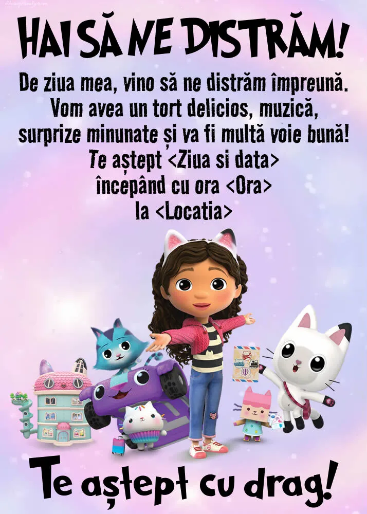 Fiecare invitație poate fi adaptată cu numele sărbătoritei, vârsta, data, ora și locul petrecerii, pentru a crea o invitație unică și memorabilă. Designurile sunt realizate cu atenție la detalii, incluzând personaje drăguțe din Gabby’s Dollhouse, fundaluri pastelate și elemente care transmit bucurie și magie. Poți trimite invitațiile în format digital (prin WhatsApp, email sau rețele sociale) sau le poți imprima pentru a le oferi în mână invitaților. Indiferent de alegere, invitațiile cu Gabby’s Dollhouse vor aduce zâmbete și entuziasm tuturor copiilor. Alege modelul preferat, personalizează-l rapid și pregătește o petrecere de poveste alături de Gabby și prietenii ei din Dollhouse!