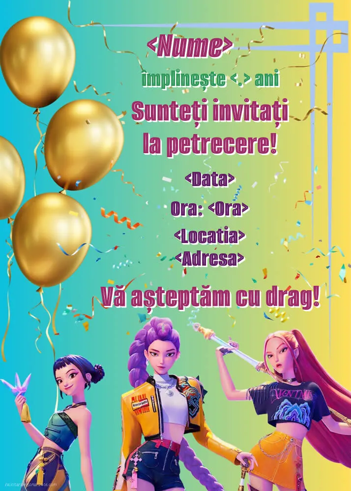 Invitațiile pot fi completate cu numele sărbătoritului, data, ora și locul evenimentului, transformând fiecare model într-o invitație unică, plină de personalitate. Poți alege să le trimiți digital (prin WhatsApp, Instagram, Facebook sau email) sau să le printezi pentru o prezentare elegantă și memorabilă. Designurile sunt inspirate de cultura K-pop: lumini de concert, microfoane, culori vibrante și simboluri specifice fandom-urilor populare. Aceste invitații sunt perfecte pentru adolescenți și tineri care iubesc formațiile BTS, Blackpink, Stray Kids, NewJeans sau alte trupe coreene de top.