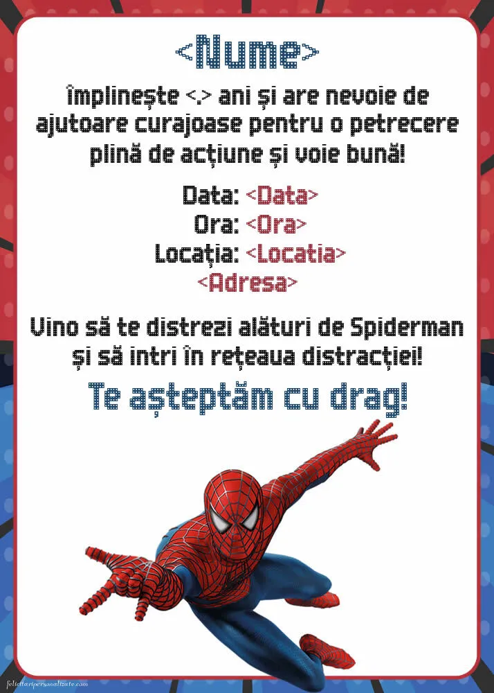 Invitația cu Spiderman este ușor de personalizat, gratuită și are dimensiunile 714px x 1000px. După ce o editezi o poți descărca sau printa rapid